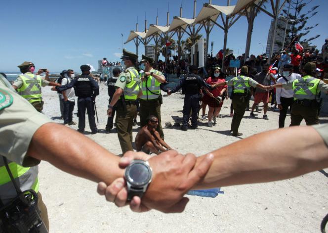 « Ça suffit. Plus d’immigrés délinquants. Fermeture des frontières. » Rassemblées derrière une longue banderole noire, plusieurs milliers de personnes ont manifesté dimanche 30 janvier à Iquique, dans le nord du Chili. Cette ville côtière est devenue, depuis 2020, un point de transit pour les migrants vénézuéliens traversant à pied, de façon irrégulière, la frontière qui sépare le Chili de la Bolivie. Faute de structures d’accueil, ils campent sur la plage ou dans la rue, dans des conditions de grande précarité, au terme d’un parcours migratoire éreintant.