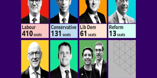 An exit poll carried out by polling company Ipsos, and paid for by the BBC, ITV and Sky says Starmer’s Labour Party will win the general election with 410 seats. The final outcome of the election should be clear by early on Friday.