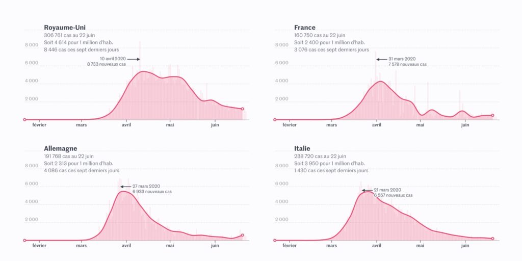 La Chine est parvenue à son pic le 13 février. La plupart des pays d’Europe de l’Ouest l’ont atteint entre la fin de mars et le début du mois d’avril, en parvenant à faire baisser le taux de reproduction du virus.