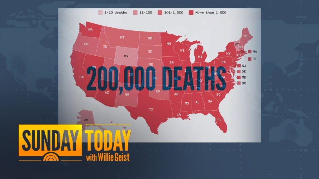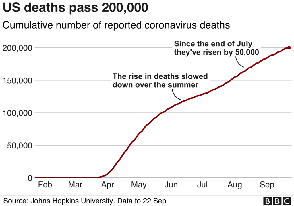 JHU reported the new death toll of 200,005 on Tuesday. The university has been collecting US and global coronavirus data since the outbreak began late last year in China. The first case in the US was confirmed in January.