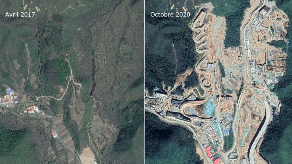 Les épreuves de ski alpin se dérouleront aussi à Yanqing, à quelques kilomètres au nord de la piste de bobsleigh. Il y a six ans, la région était totalement inhabitée, comme l’attestent ces images satellite prises avant et pendant la construction de la station.