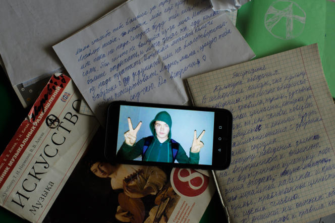 Les cahiers d’Žcolier et les lettres de Nikita Ouvarov, 15 ans, accusŽ de terrorisme, dans la ville de Kansk, en SibŽrie.