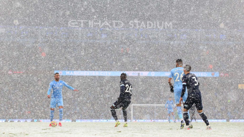 La pause permettait au personnel de l’Etihad de déblayer la neige et de faire en sorte que la deuxième période se déroule normalement.