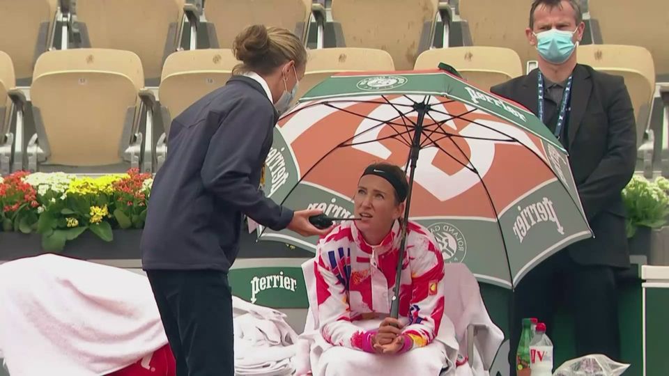 Alors que les premiers matches de la quinzaine parisienne débutaient sous un temps pluvieux et frais (11°C), accompagné de rafales de vent, Azarenka qui menait 2 jeux à 1 face à la Monténégrine Danka Kovinic s’est adressée à l’arbitre.