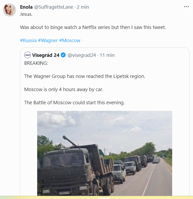 In a previous post (below), we reported on a Wagner convoy that was spotted north of Voronezh, a city in which Wagner has reportedly seized military facilities.