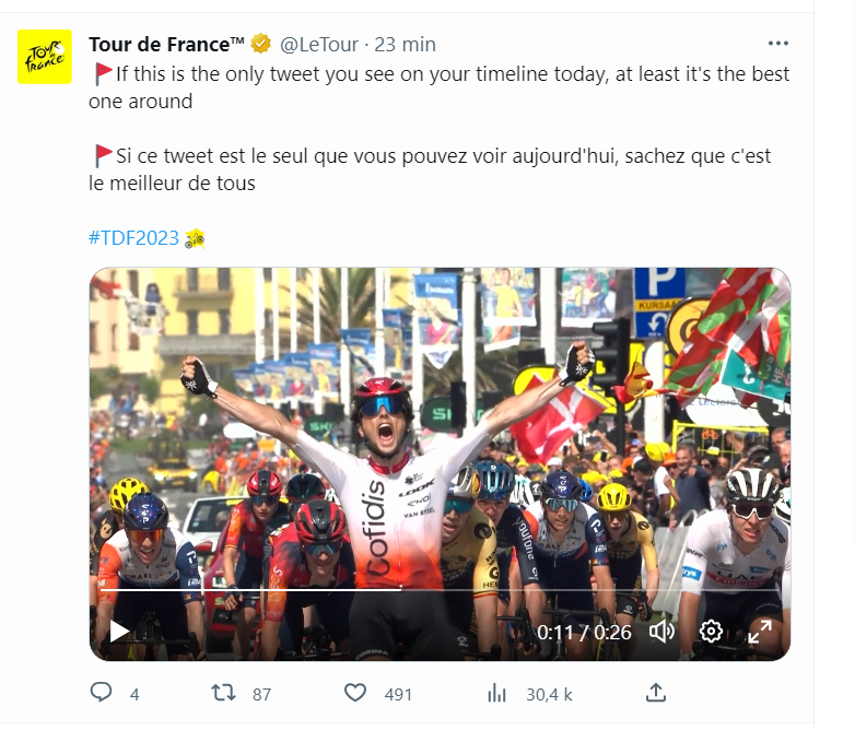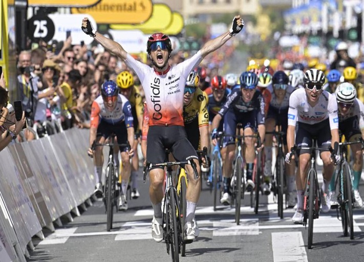 Personne n’a vu venir l’attaque du Tricolore. Bien placé dans le groupe de 24 coureurs qui allaient se jouer la victoire après avoir basculé au sommet du Jaizkibel en bonne position, le coureur de la Cofidis a placé son attaque au meilleur moment, à 800 mètres de l’arrivée. Disposant de quelques dizaines de mètres d’avance, il a résisté au retour de Wout Van Aert, plus rapide que ses adversaires au sprint mais trop juste pour dépasser le Français sur la ligne. Il offre une première victoire à Cofidis sur le Tour de France depuis celle de Sylvain Chavanel à Montluçon en 2008.