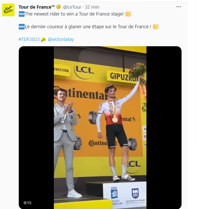 Après 15 ans d’attente, Cofidis a renoué avec la victoire sur le Tour de France. Le Français Victor Lafay s’est imposé ce dimanche lors de la deuxième étape du Tour de France entre Vitoria-Gasteiz et Saint-Sébastien. Il a devancé Wout Van Aert (Jumbo-Visma) et Tadej Pogacar (UAE-Emirates). Arrivé au sein du peloton de tête, Adam Yates conserve son maillot jaune.