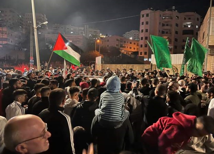 A big crowd has gathered around the Red Cross vehicle at the Beitunia checkpoint in the West Bank, where 39 Palestinians freed from Israeli prison are set to be released.